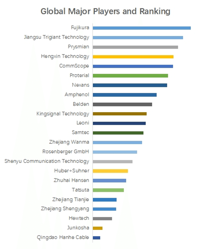 QYResearchのトップ企業研究センターによると、高周波同軸ケーブルの世界的な主要製造業者には、Fujikura、Jiangsu Trigiant Technology、Prysmian、Hengxin Technology、CommScope、Proterial、Amphenol、Nexans、Belden、Kingsignal Technologyなどが含まれている。2023年、世界のトップ10企業は売上の観点から約32.0%の市場シェアを持っていた。
